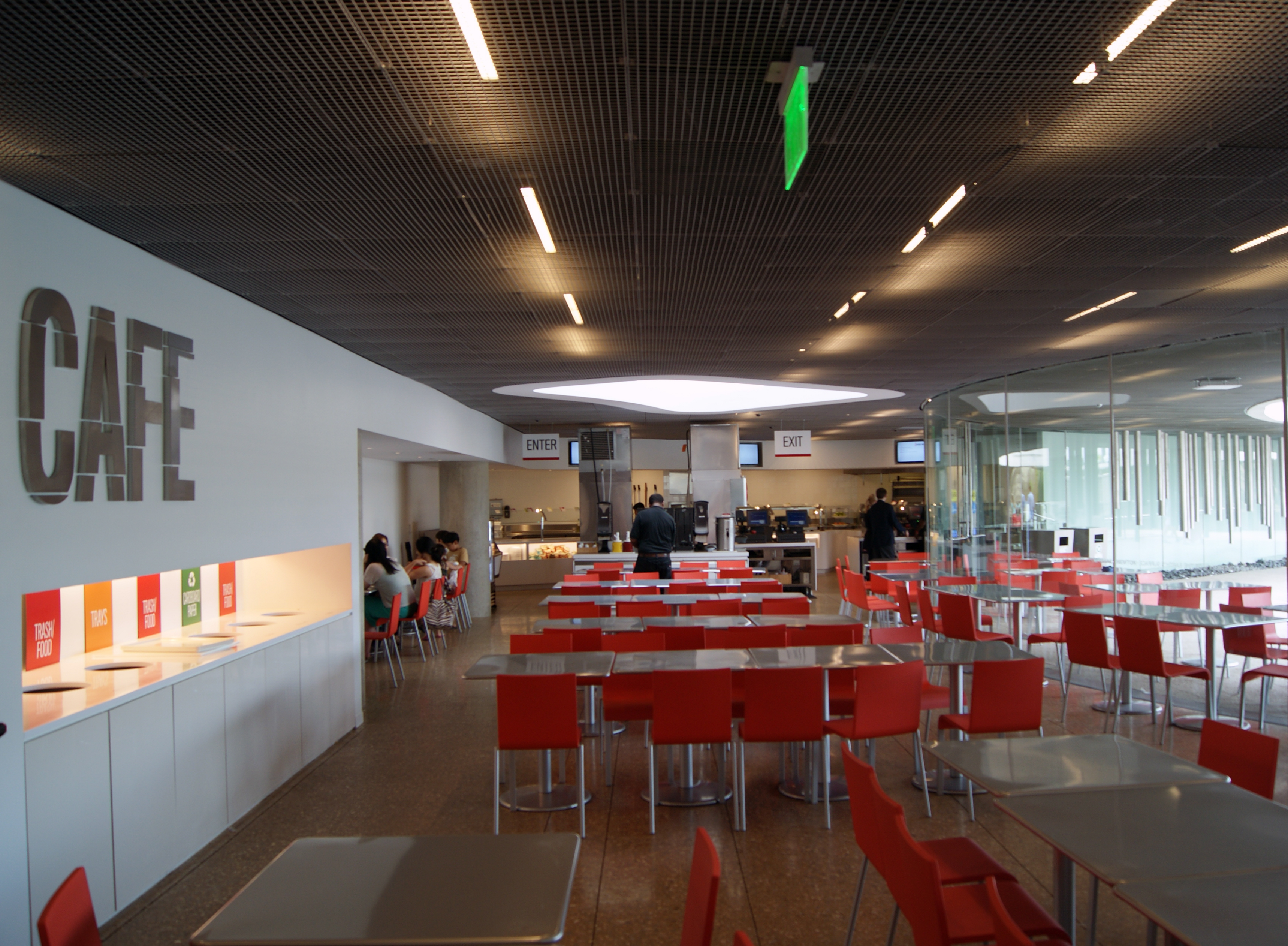 From what I could tell, the building is mostly made of concrete and glass. The whole first floor’s ceiling is clad in a perforated metal screen that filters little strips of light. Very fun. It reminded me of something from out of Star Wars.