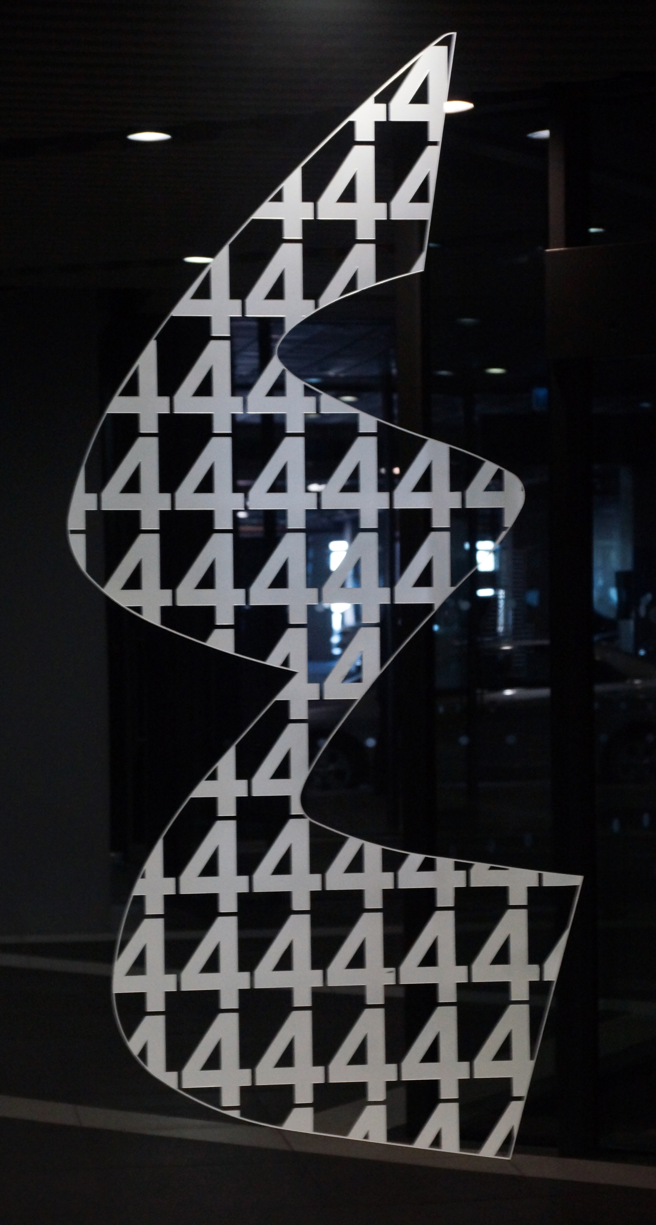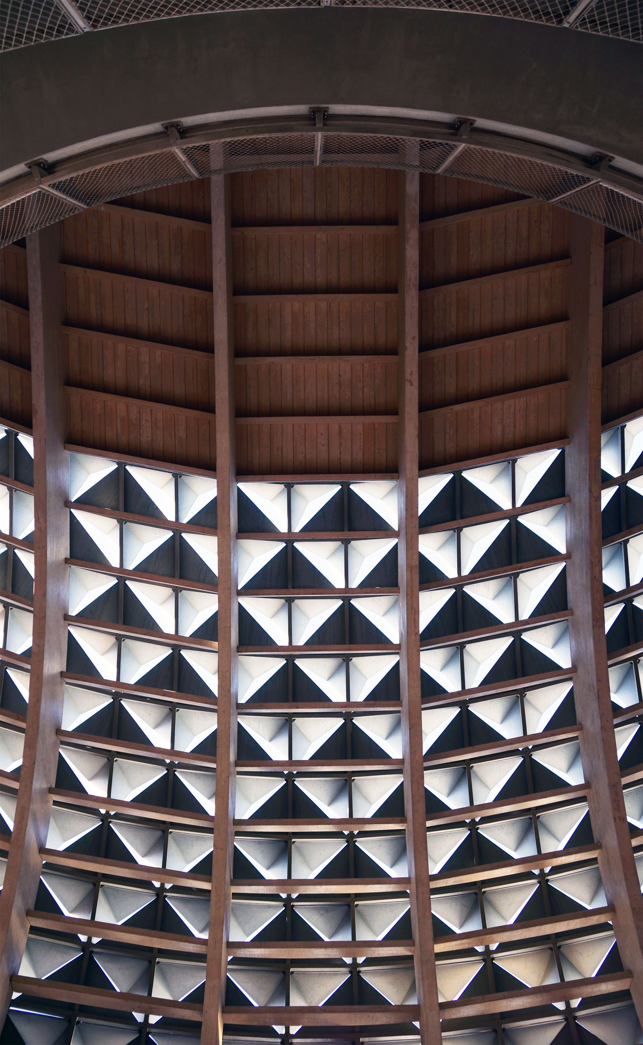 Massive, curved glulams hold up a metal screen that allows diffused light to enter the library (above). Inside is a DNA-strand-looking, concrete staircase which I was not allowed to go up… (below).