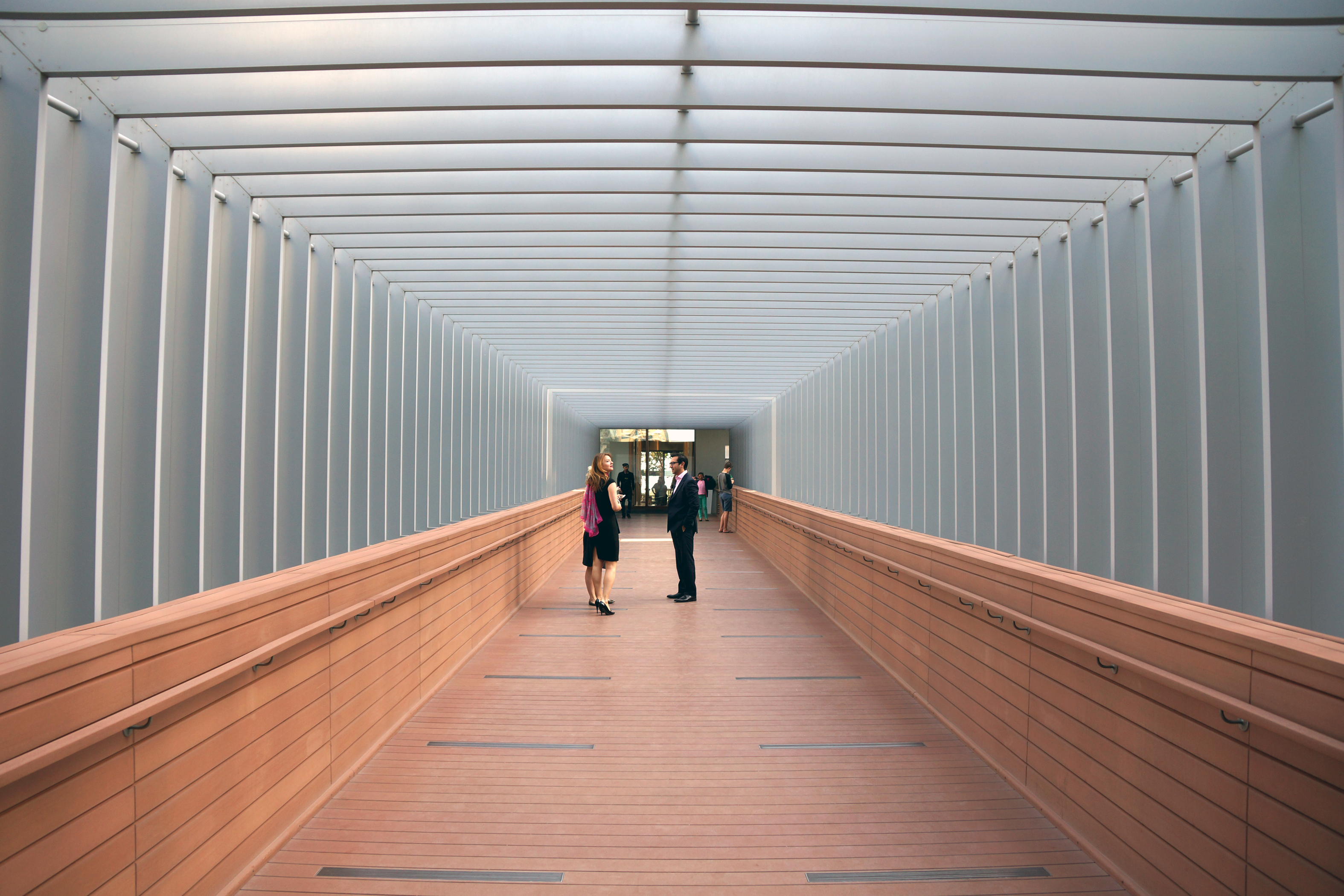 ^A pedestrian bridge with a rib-like shade structure.