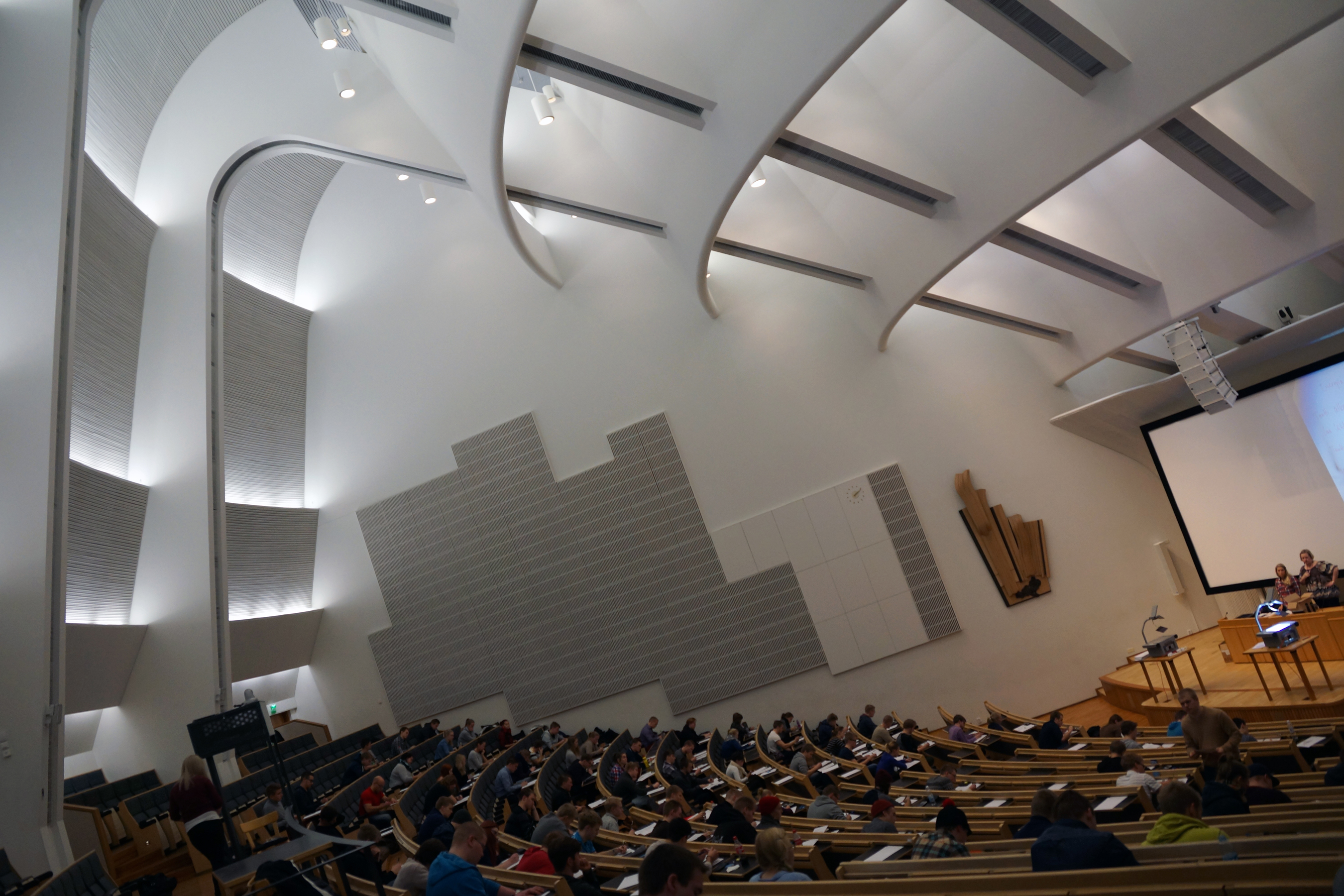 Because of the significant amount of work Alvar Aalto had done for this University (formerly 3 different universities, if I understand the history correctly…), this school was named Aalto University and is home to some of the Finnish Architect’s masterpieces. The most prominent of which (in my mind) is the lecture hall pictured above (and below).