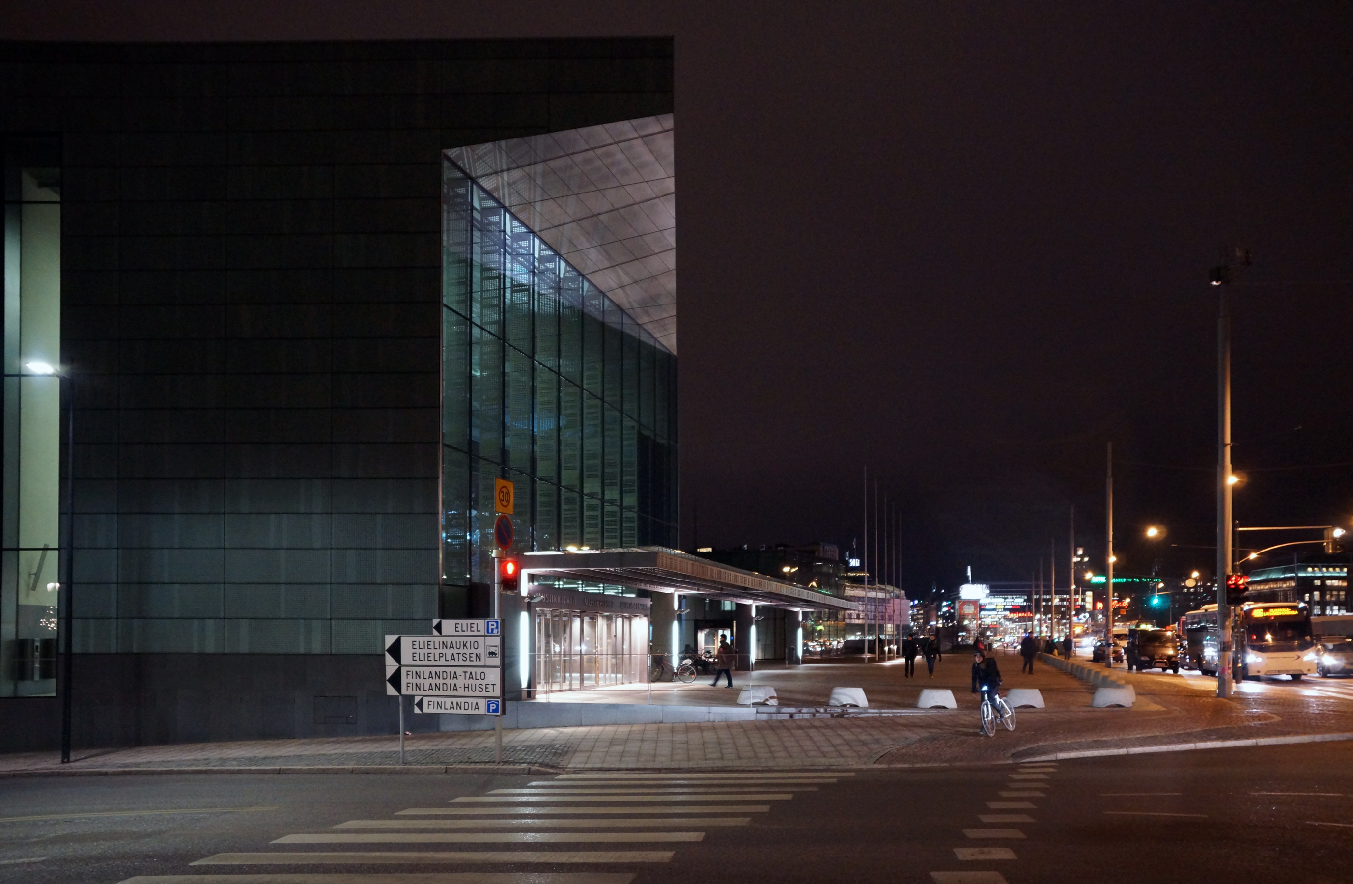 At night the large glazed portions of the volumes glow warm green in the cold Helsinki night.